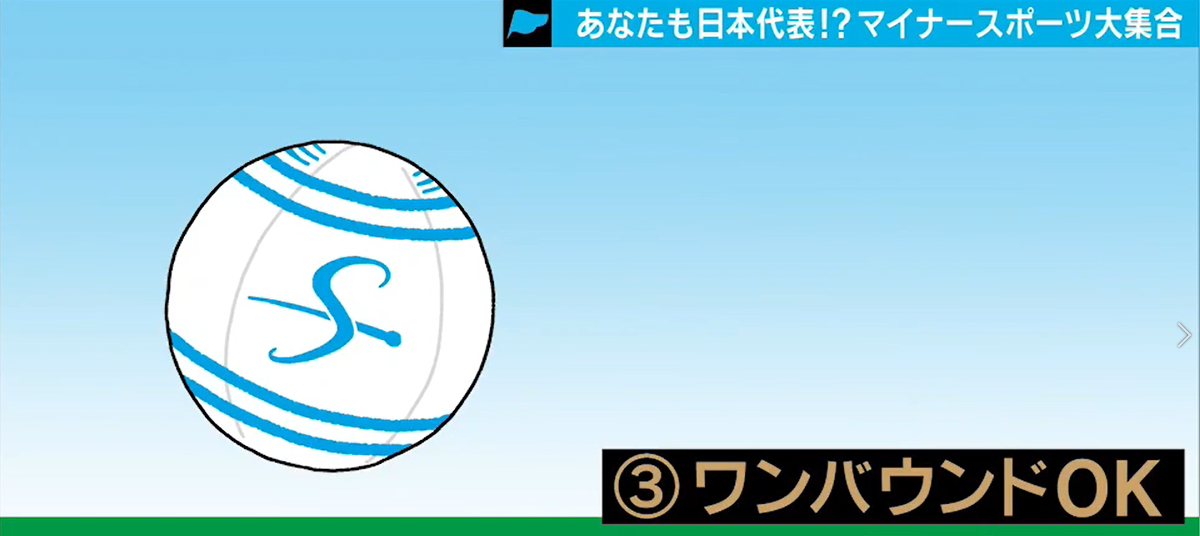 同一のプレーヤ―が、ターン内に2回ボールに触れる。複数回のボールタッチがある場合は、それぞれのプレーヤーが異なる必要がある。